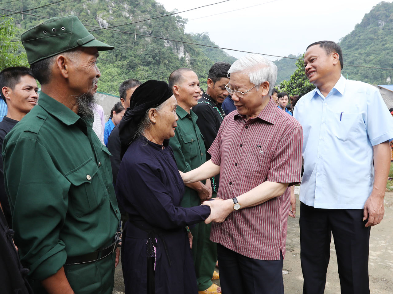 Tổng Bí thư Nguyễn Phú Trọng ân cần thăm hỏi nhân dân xã Sĩ Bình, huyện Bạch Thông, tỉnh Bắc Kạn_Ảnh: TTXVN