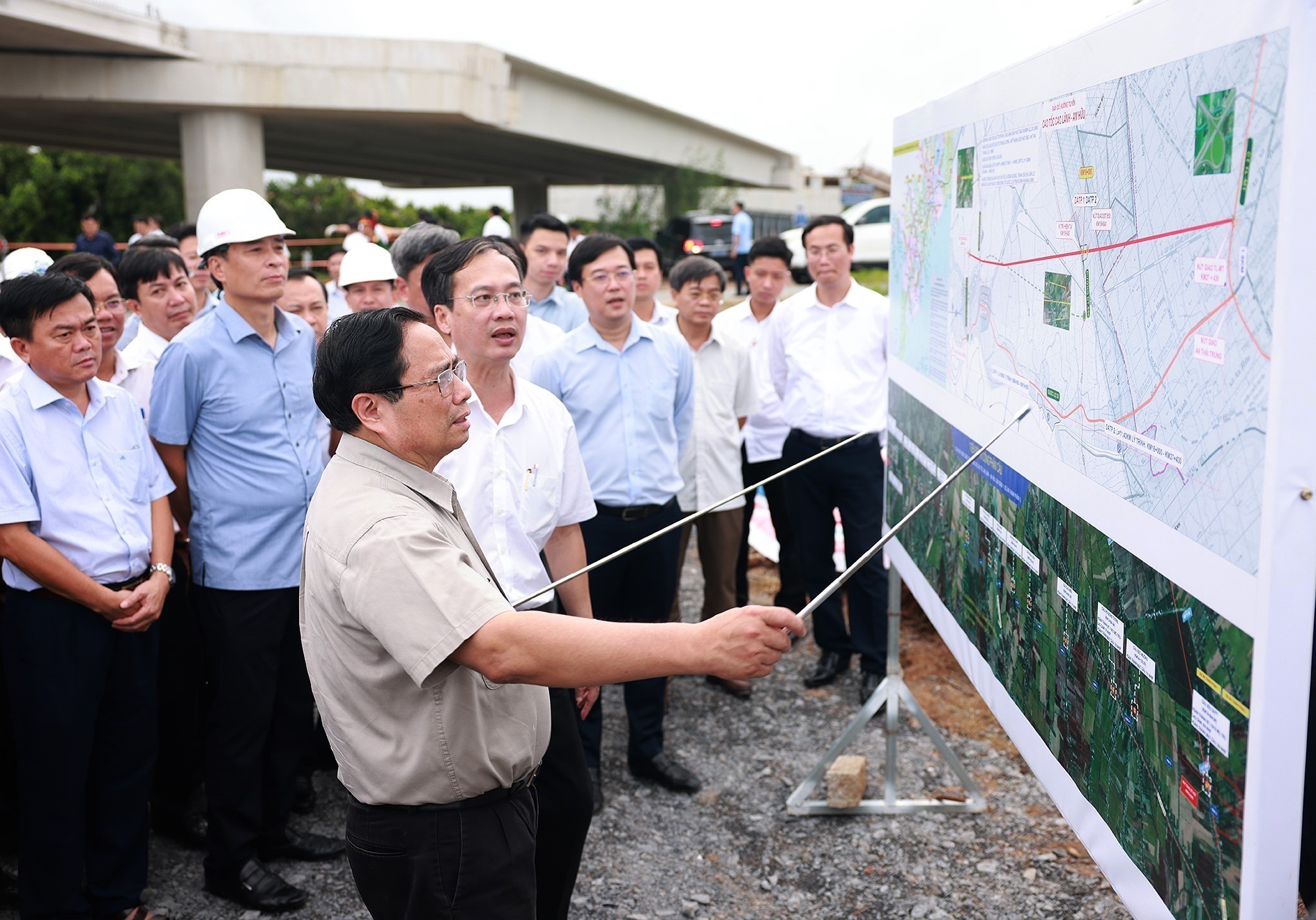 Ủy viên Bộ Chính trị, Thủ tướng Chính phủ Phạm Minh Chính kiểm tra tiến độ thi công dự án đường bộ cao tốc Cao Lãnh – An Hữu giai đoạn 1 tại tỉnh Đồng Tháp_Ảnh: TTXVN