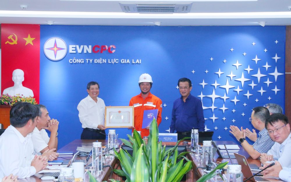 Lãnh đạo EVNCPC và Công ty Điện lực Gia Lai trao khen thưởng cho đồng chí Lê Thanh Tấn - Tổ trưởng Tổ Quản lý kỹ thuật, Đội Quản lý Điện Tuy Phước, Công ty Điện lực Gia Lai vì hành động dũng cảm cứu người_Ảnh: EVN