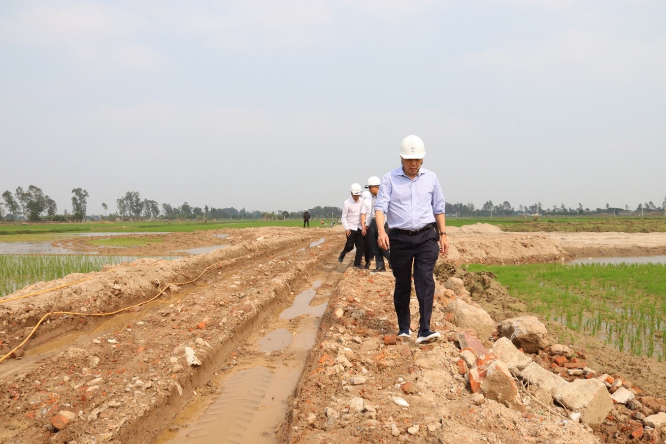 Chủ tịch HĐTV EVN Đặng Hoàng An kiểm tra các vị trí móng cọc đang chậm tiến độ dự án đường dây 500kV NMNĐ Nam Định 1 - Phố Nối_Nguồn: EVN