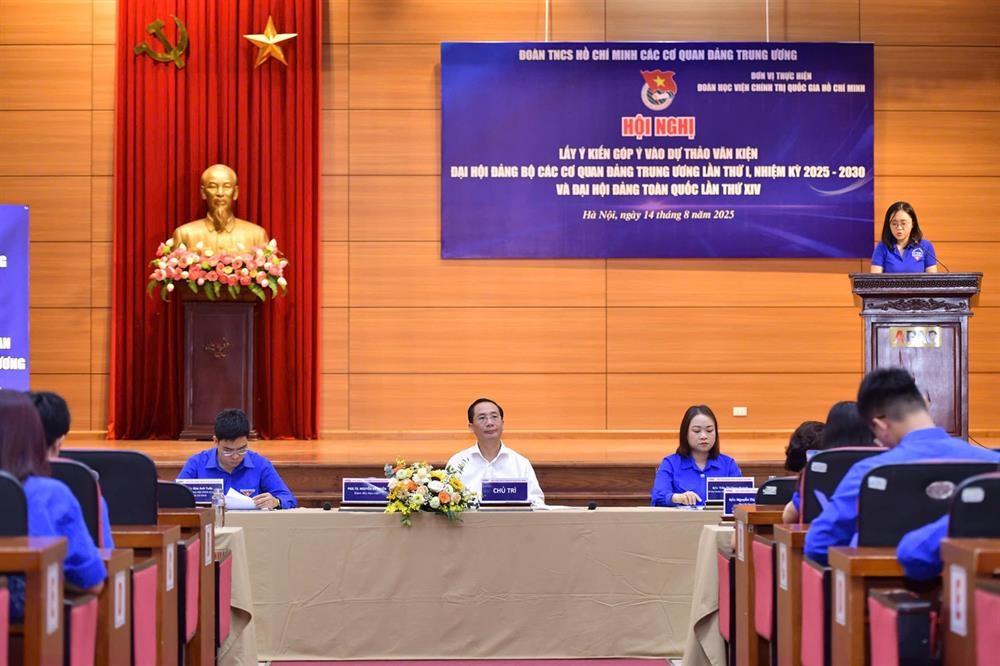 TCCS - Ngày 14-8-2025, tại Hà Nội, Ban Thường vụ Đoàn Thanh niên Cộng sản Hồ Chí Minh các cơ quan Đảng Trung ương tổ chức Hội nghị lấy ý kiến góp ý vào dự thảo các văn kiện Đại hội Đảng bộ các cơ quan Đảng Trung ương lần thứ I, nhiệm kỳ 2025 - 2030 và Đại hội XIV của Đảng. PGS. TS Nguyễn Bá Chiến, Giám đốc Học viện Hành chính và Quản trị công (Học viện Chính trị Quốc gia Hồ Chí Minh) chủ trì hội nghị; các chuyên gia, đại diện Đảng ủy các cơ quan Đảng Trung ương, lãnh đạo Đảng uỷ Học viện Chính trị quốc gia Hồ Chí Minh, Đoàn Thanh niên các cơ quan Đảng Trung ương và đoàn viên, thanh niên trực thuộc đoàn thành niên các cơ quan Đảng Trung ương cùng dự hội nghị.