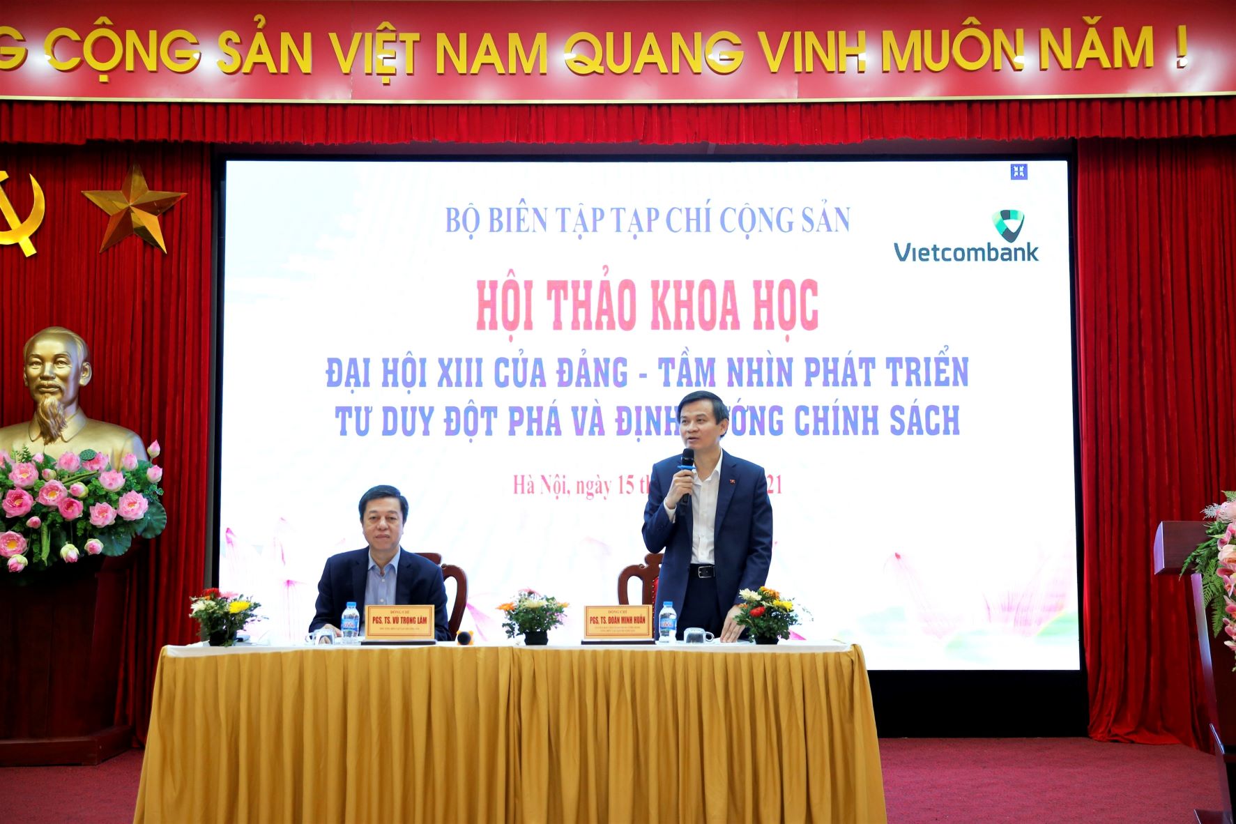 PGS, TS. Đoàn Minh Huấn, Ủy viên Trung ương Đảng, Tổng Biên tập Tạp chí Cộng sản; PGS, TS. Vũ Trọng Lâm, Phó Tổng Biên tập Tạp chí Cộng sản chủ trì hội thảo.