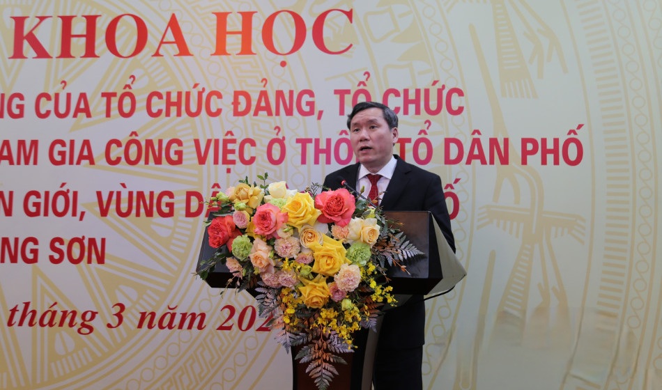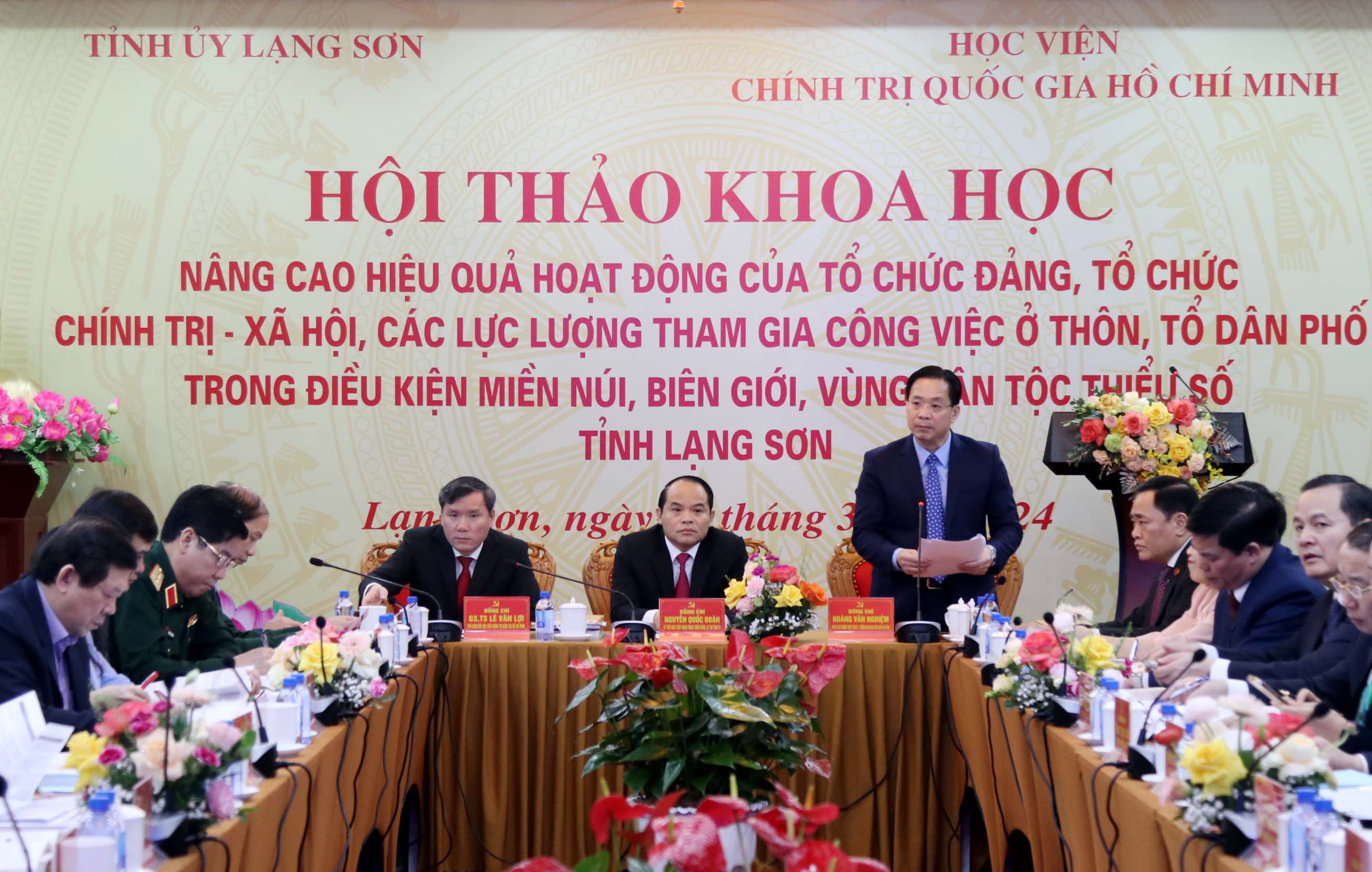 TCCS - Ngày 19-3-2024, tại tỉnh Lạng Sơn, Tỉnh ủy Lạng Sơn phối hợp với Học viện Chính trị quốc gia Hồ Chí Minh tổ chức Hội thảo khoa học: “Nâng cao hiệu quả hoạt động của tổ chức đảng, tổ chức chính trị - xã hội, các lực lượng tham gia công việc ở thôn, tổ dân phố, trong điều kiện miền núi, biên giới, vùng dân tộc thiểu số tỉnh Lạng Sơn”.