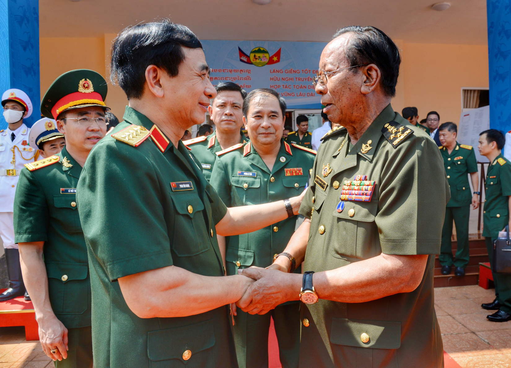 Đại tướng Phan Văn Giang, Ủy viên Bộ Chính trị, Bộ Trưởng Bộ Quốc phòng cùng Phó Thủ tướng, Bộ trưởng Bộ Quốc phòng Campuchia Samdech Pichey Sena Tea Banh dự Chương trình Giao lưu hữu nghị quốc phòng biên giới Việt Nam - Campuchia _Ảnh: TTXVN