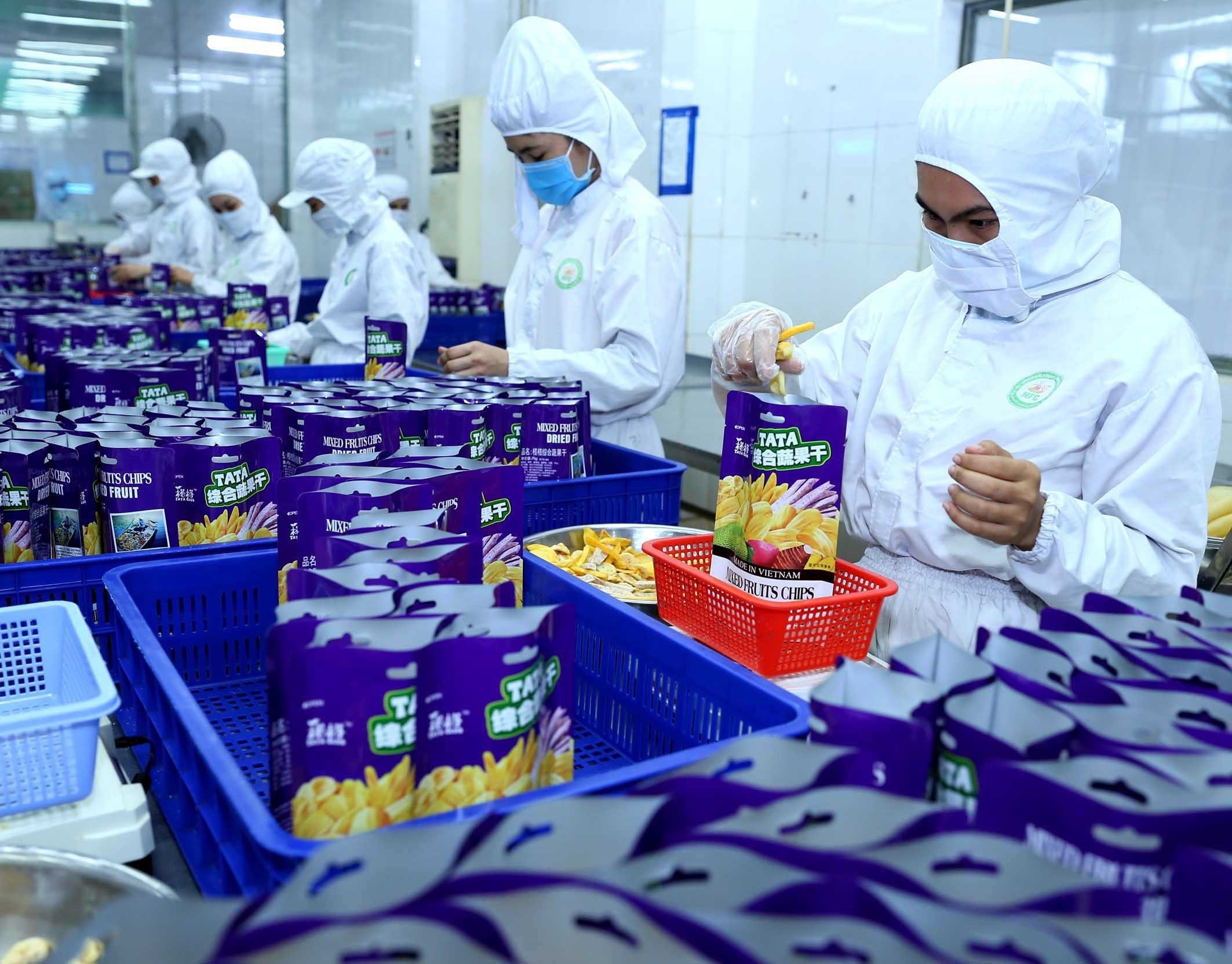 Đóng gói sản phẩm nông sản sấy khô của Công ty TNHH trái cây Mê Kông tại khu công nghiệp Trà Nóc, quận Bình Thủy, thành phố Cần Thơ xuất khẩu sang các thị trường Trung Quốc, Canada, Đức, Campuchia _Ảnh: TTXVN