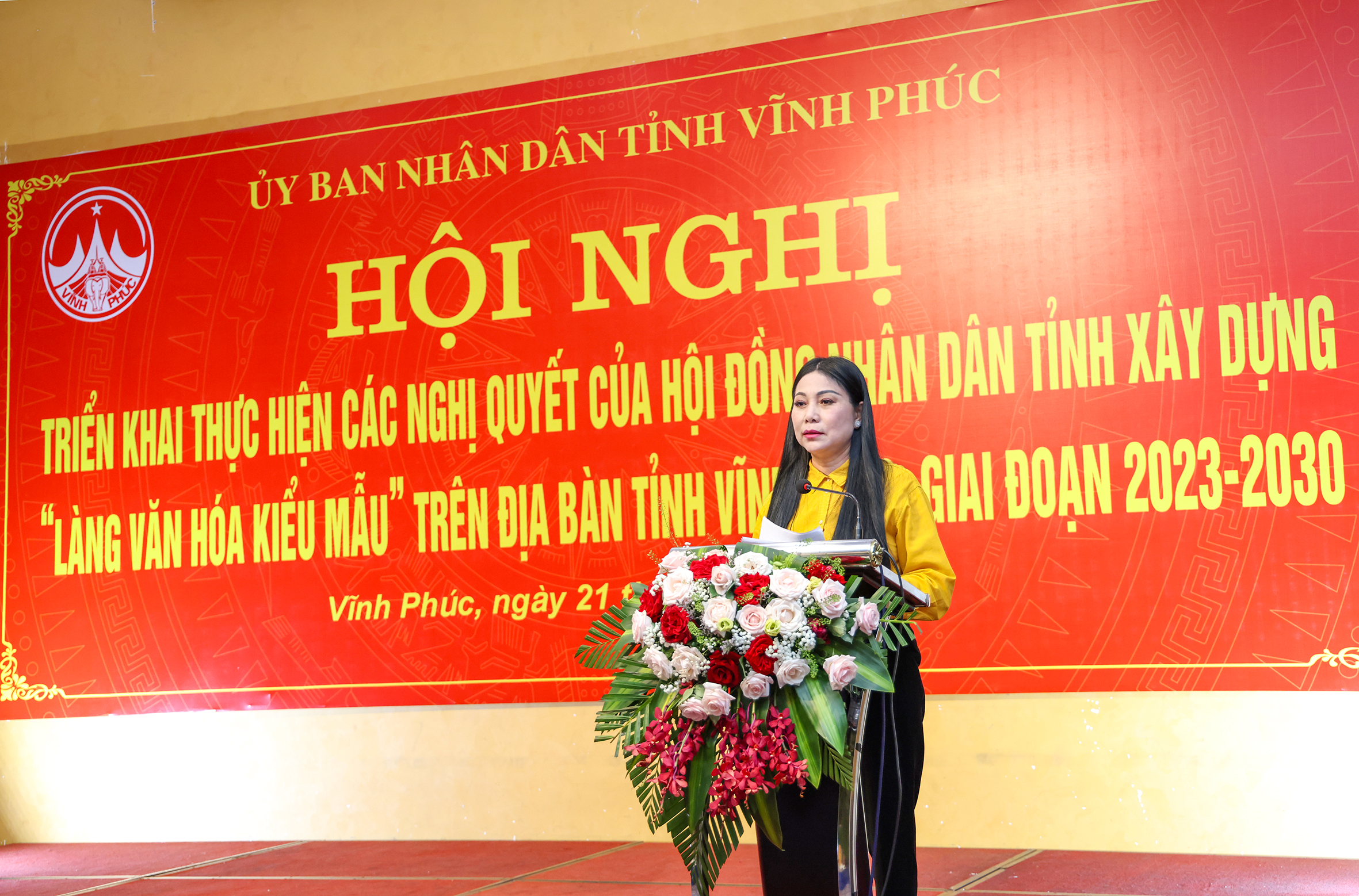 Hội nghị tổ chức quán triệt, triển khai 2 nghị quyết của Hội đồng nhân dân tỉnh, gồm: Nghị quyết số 06/2023/NQ-HĐND, ngày 5-5-2023, của Hội đồng nhân dân tỉnh, “Về việc Ban hành Quy định một số chính sách đặc thù hỗ trợ xây dựng “Làng văn hóa kiểu mẫu” trên địa bàn tỉnh Vĩnh Phúc, giai đoạn 2023-2030”; Nghị quyết số 08/NQ-HĐND, ngày 5-5-2023, của Hội đồng nhân dân tỉnh, “Về việc Thông qua Đề án xây dựng “Làng văn hóa kiểu mẫu” trên địa bàn tỉnh Vĩnh Phúc, giai đoạn 2023-2030”.